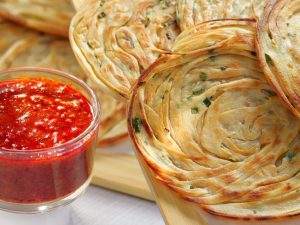 Hara Pyaz Lacha/Thread Paratha with Kathiawari Chutney