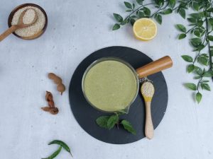 Now add tamarind pulp, fresh coriander, mint leaves, garlic, green chillies, cumin seeds, salt, water & blend well.Add water to adjust consistency (if required).
