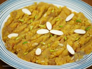 Add reserved ghee,mix well and cook until it leaves the sides of the pot (approx. 10-12 minutes) and mix continuously.