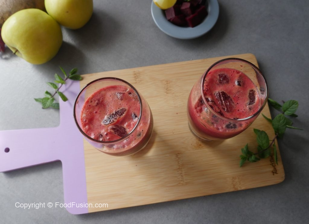 Juicer machine mein saib,chukandar,gajar aur adrak dal ker juice nikal lein.