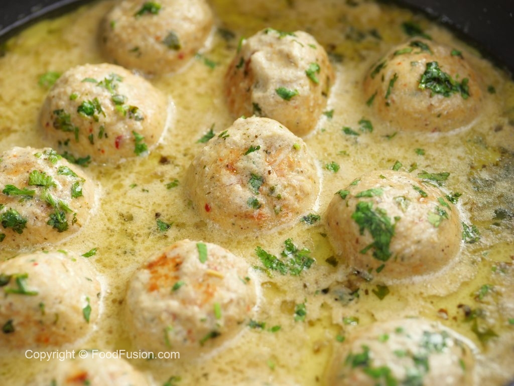 -In a wok,add cooking oil,prepared chicken koftay & fry on low flame from all sides until light golden & set aside (makes 12).