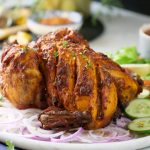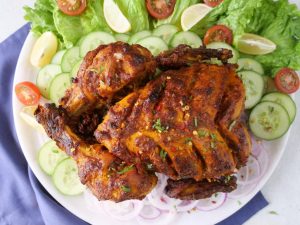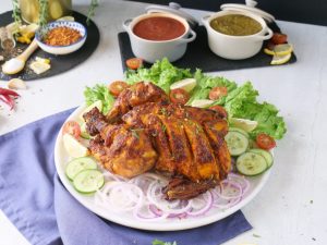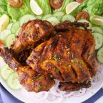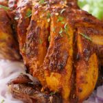 -Whole chicken dal dein aur marinade ko ache tarhan laga lein aur chicken per ache tarhan massage karein,chicken legs ko kitchen thread sa tie ker lein aur dhak ker 2-4 hours kliya marinate ker lein & side per rakh dein.