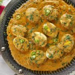 -Place halved eggs,pour gravy,sprinkle fresh coriander,green chilli,cover & cook on low flame for 1-2 minutes & serve!