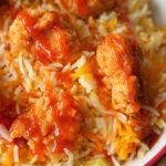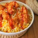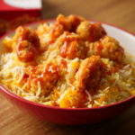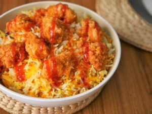 In serving dish,add cooked rice,fried chicken shots and drizzle red sauce.