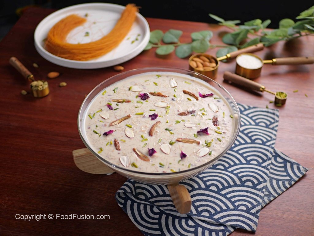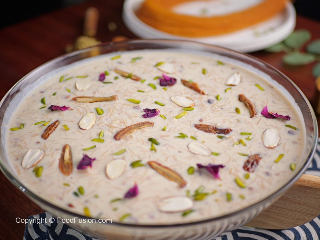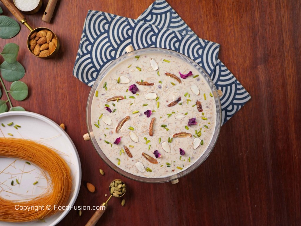 -In a serving dish, add badami sheer khurma, garnish with pistachio, almonds, dried rose petals & serve!