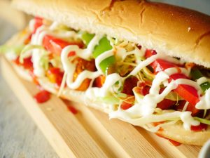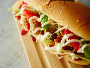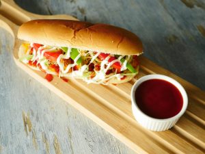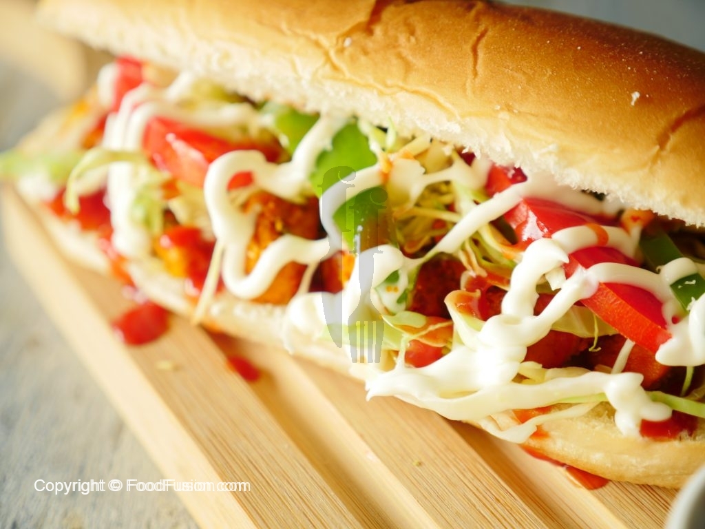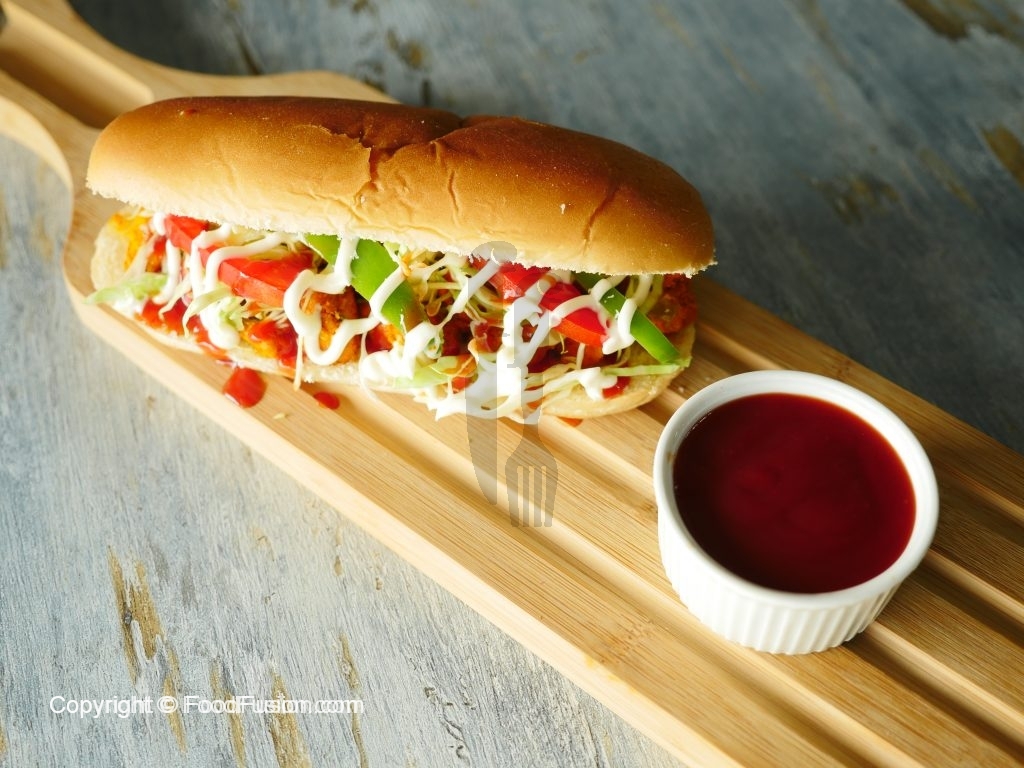 Burger bun per mayonnaise laga ker cooked chicken,tomato ketchup,bund gobhi,tamatar,shimla mirch, mayonnaise aur tomato ketchup dal ker top bun sa cover ker lein & serve karein.
