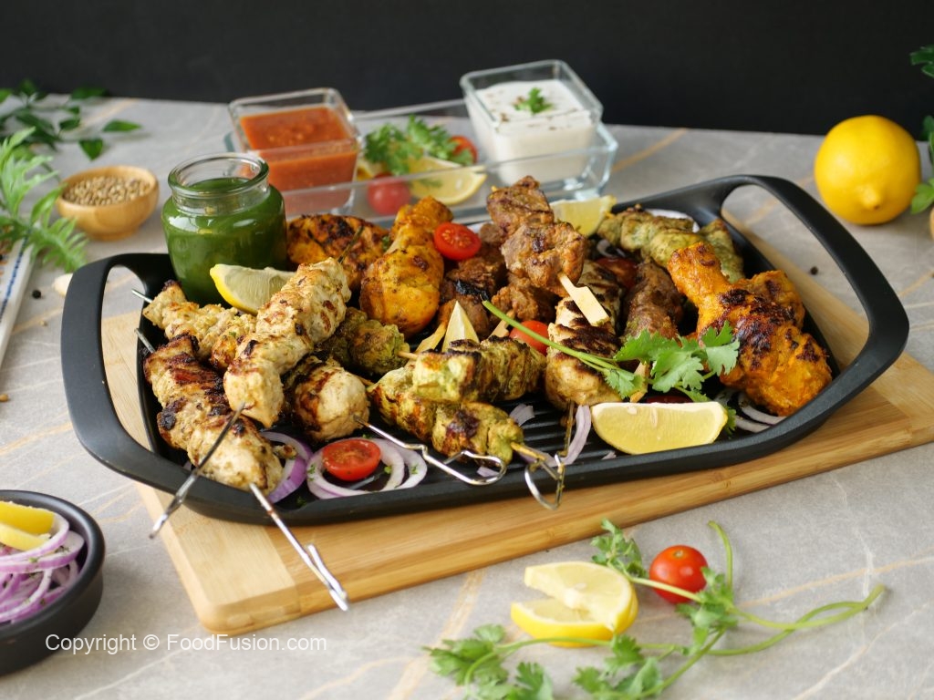 One marinade for a platter of four different BBQ recipes. You can make a delicious, full of variety bbq platter with less efforts easily. A little bit of everything in this BBQ KababPlatter #FoodFusion #HappyCookingToYou