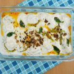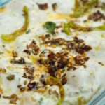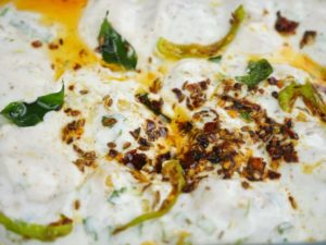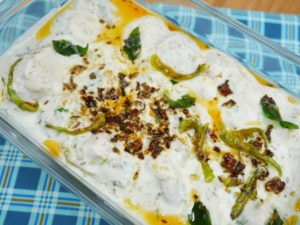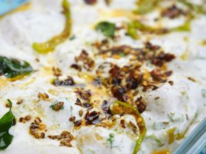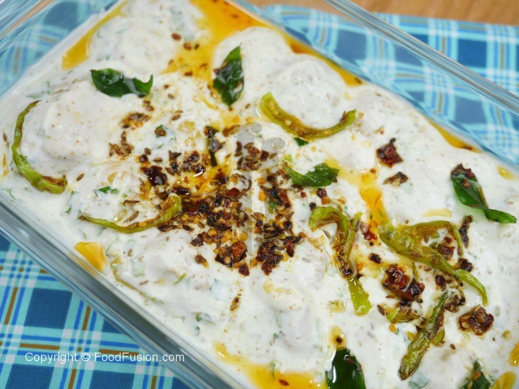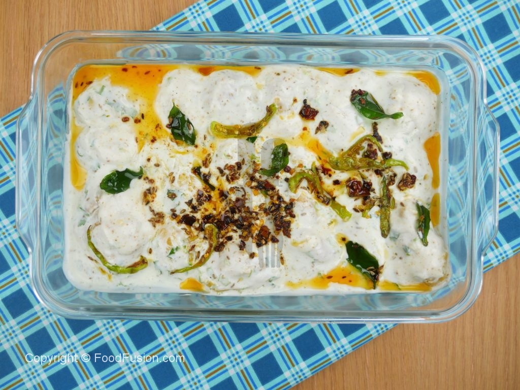 In serving dish,add fried baray (dumplings) and spiced yogurt.
