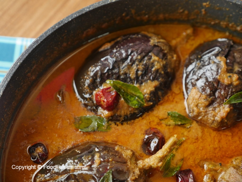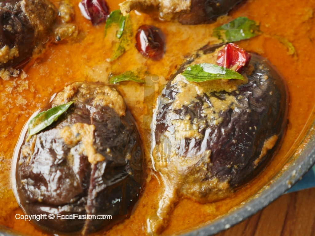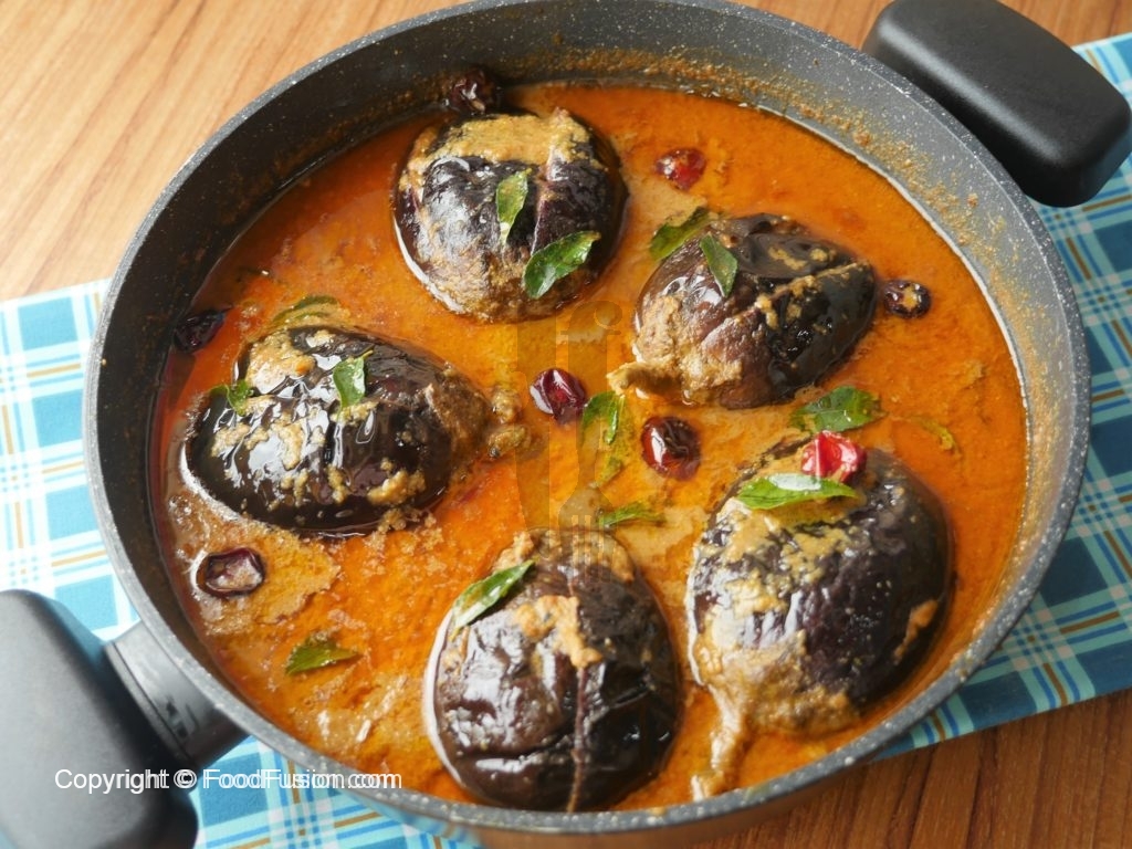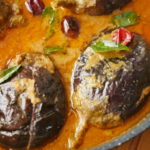 Take egg plants,make 4 small cuts in the eggplant but don’t separate them and keep them intact, including the stem,sprinkle salt and stuffed with ground spice mixture & set aside.