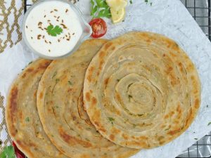 -Heat griddle,place paratha,add clarified butter & fry from both sides until golden brown (makes 6).