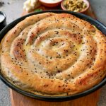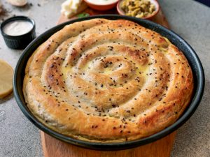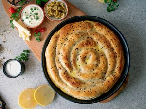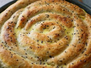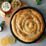 On 10” round baking dish with prepared egg & yogurt mixture (2 tbs),spread evenly & set aside.
