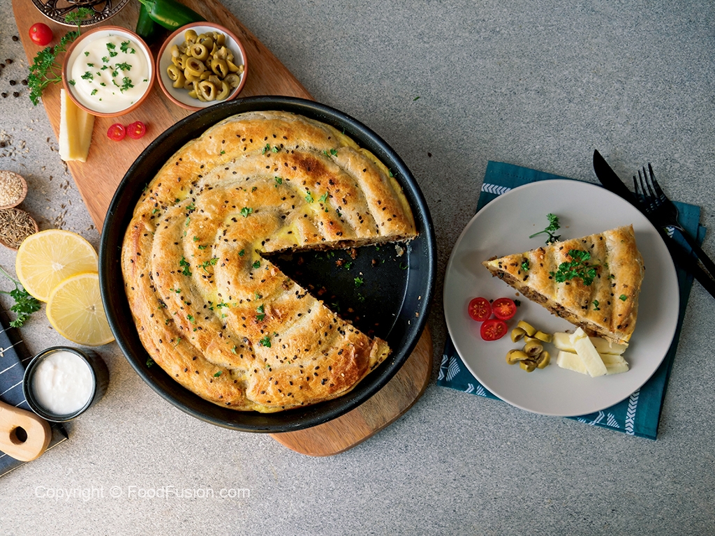 Clean working surface per maida chirak dein aur plain paratha rakh ker stretch ker ka square shape bana lein,egg & yogurt mixture ko brush ki madad sa laga lein aur cooked qeema (2-3 tbs) daldein aur roll ker ka tube bana lein.