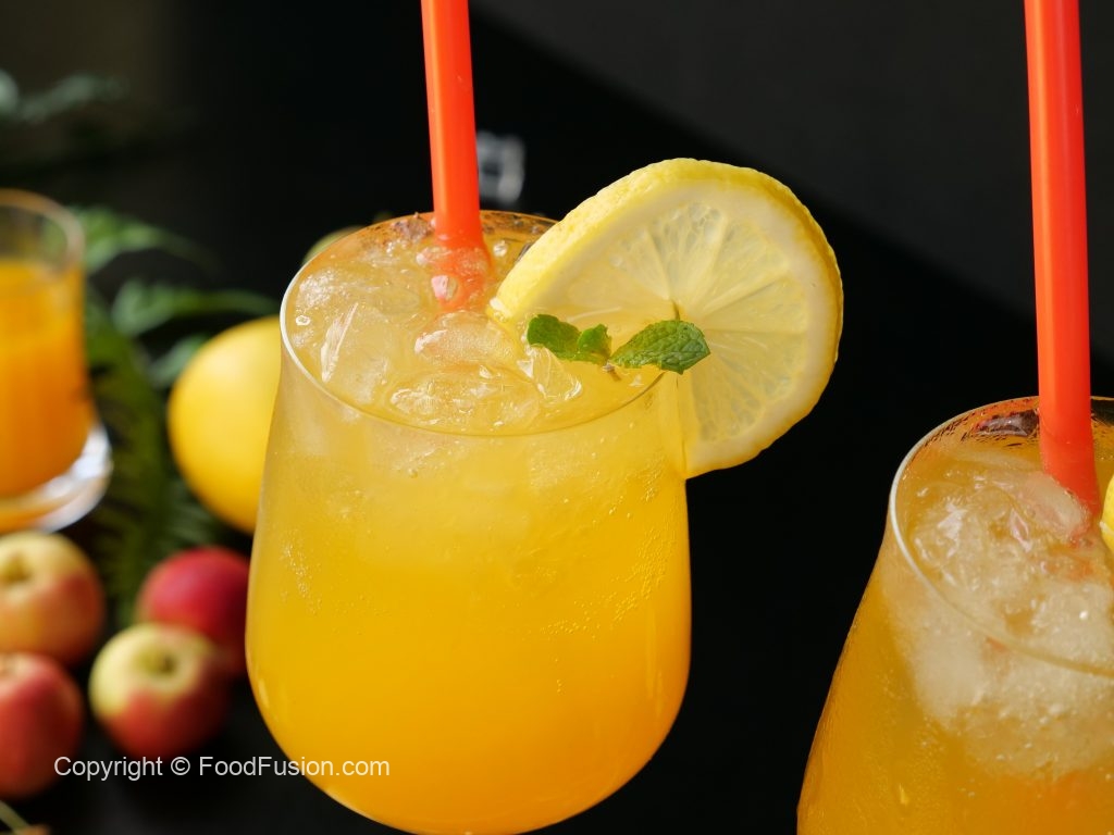 In a serving glass,add prepared lemon syrup,pineapple juice,orange juice,ice & 7up.