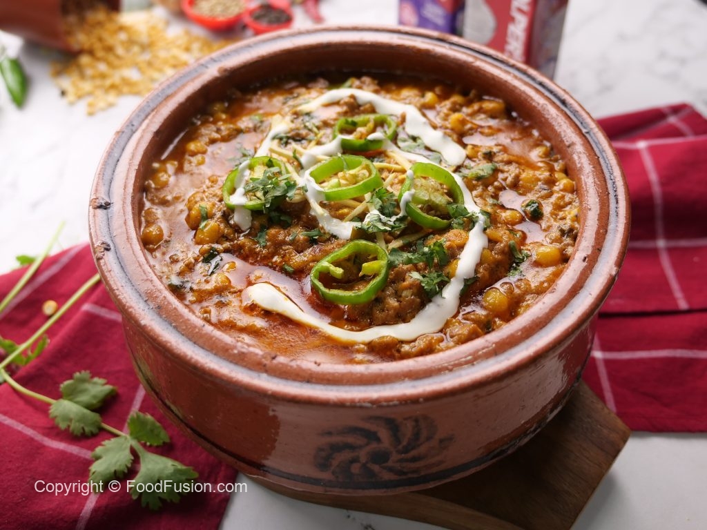 -Tayyar chana daal qeema dal dein,hara dhania,adrak,hari mirch aur cream dal ker serve karein!