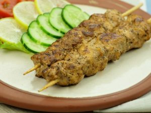 With the help of wet hand,take small quantity (85g) of mixture,make a ball & skew on metal skewers.