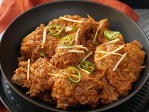 -Add fried chicken & mix well,cover & cook on low flame for 15-20 minutes then cook on high flame until oil separates.