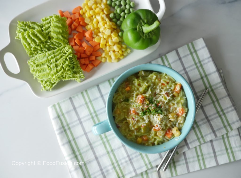 Shimla mirch,kernel corns,green noodles cake,taste maker,soy sauce,lal mirch crushed,namak aur cheddar cheese dal ker ache tarhan mix karein.