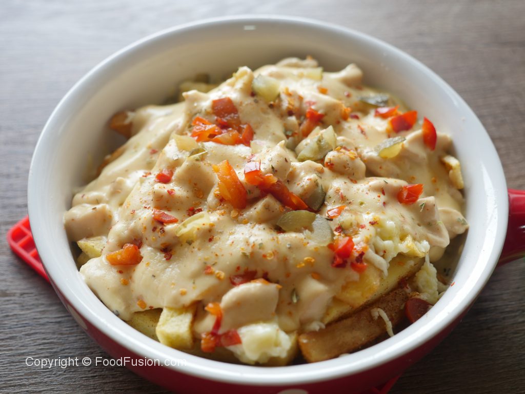 Serving platter mein potato fries aur tayyar seasoning dal ker ache tarhan mix karein phir mozzarella cheese,red jalapenos pepper,pickled cucumber,tayyar white sauce,lal mirch crushed,dried oregano,red jalapenos pepper aur pickled cucumber dal dein & serve karein!