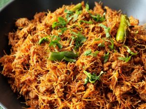 Now add cooked chicken mixture and mozzarella cheese,fold and cook on low flame for 30 seconds & serve!