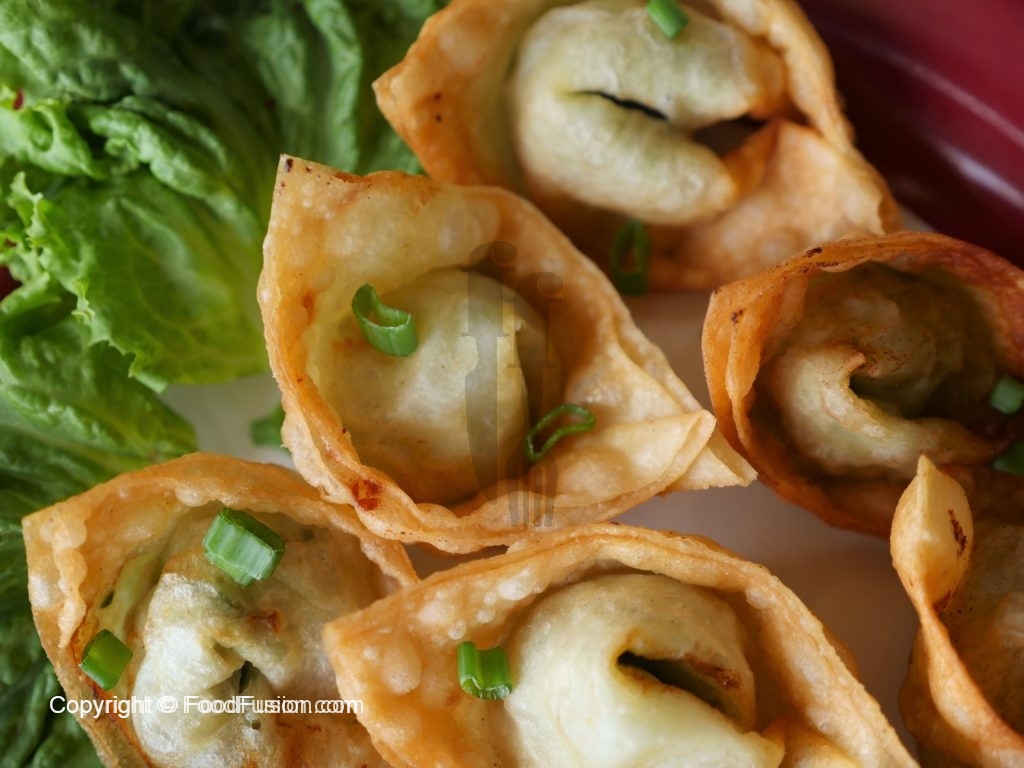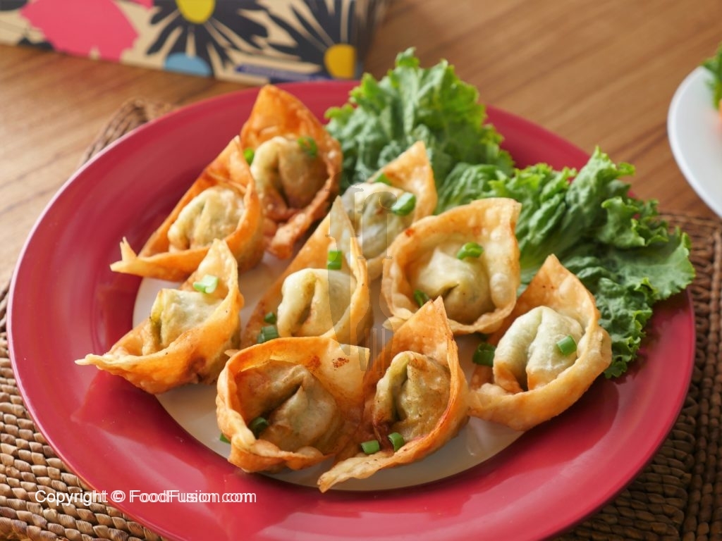 Apply egg on one side of triangle and overlap to form wonton shape (makes 25-30).