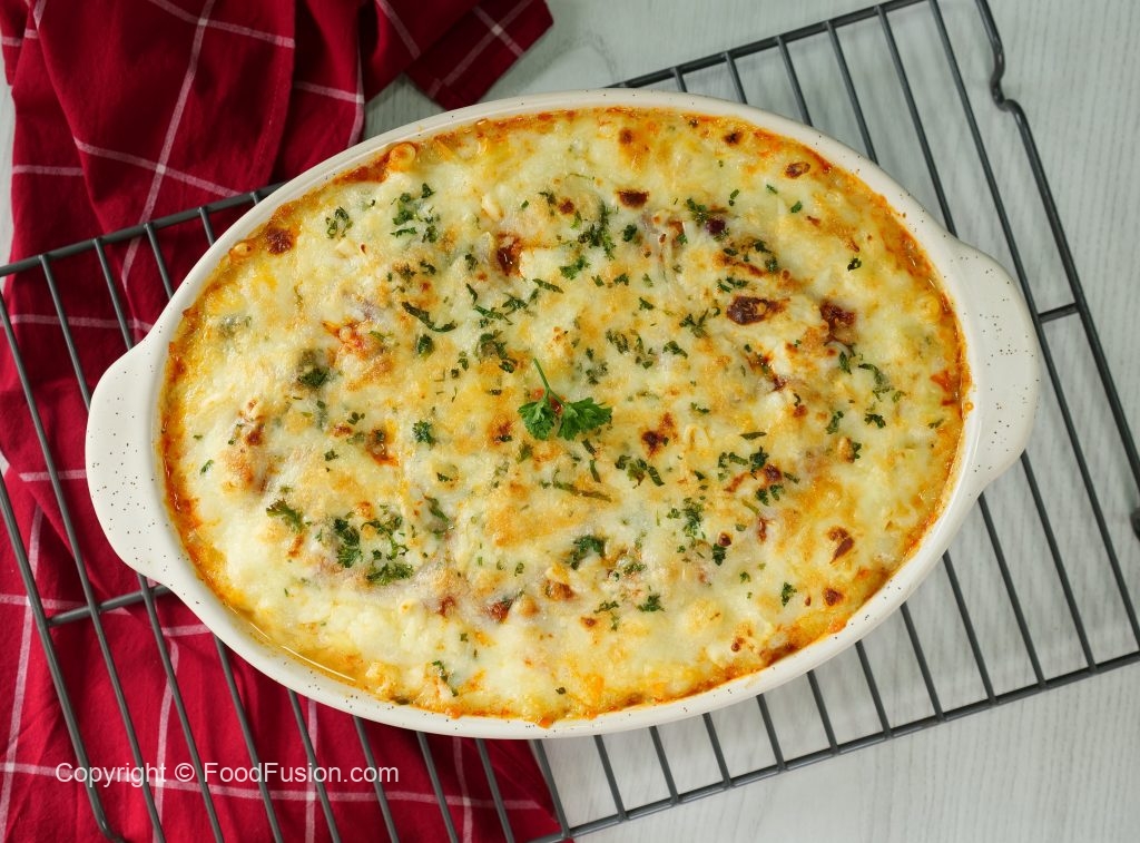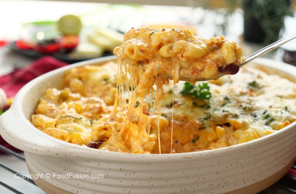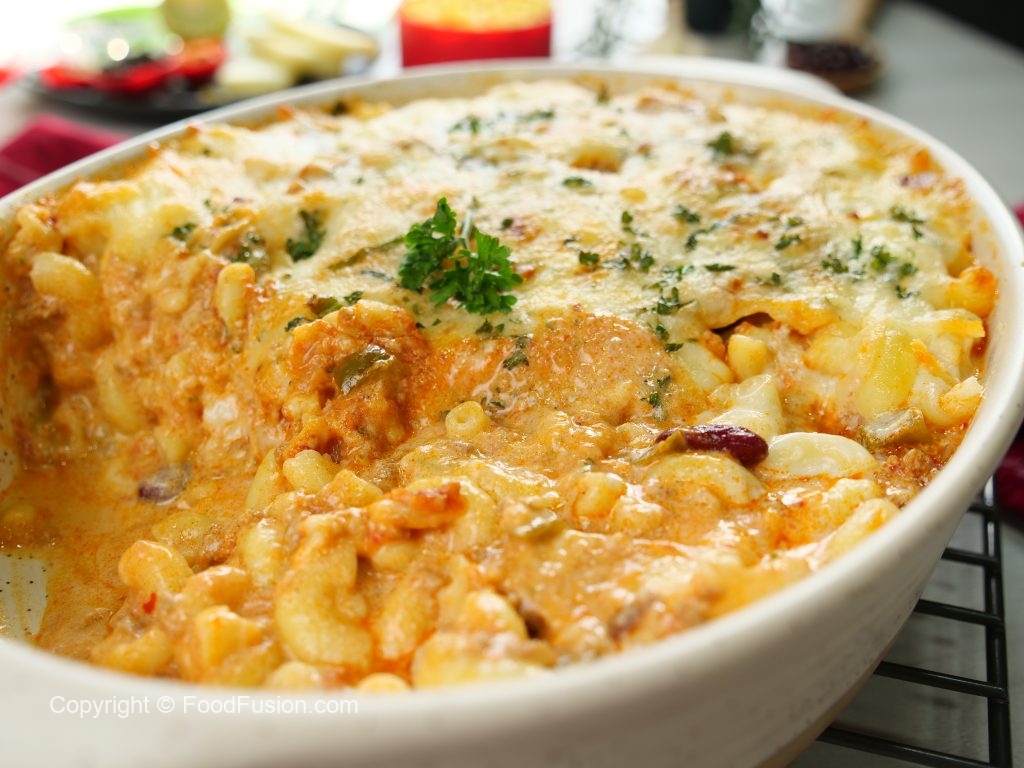 -Baking dish mein tayyar mince mixture,mac & cheese,mince mixture,mac 7 cheese,mince mixture, cheddar cheese,mozzarella cheese & fresh parsley dal dein.