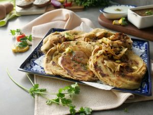 Apply butter and sprinkle fresh coriander & serve with raita!