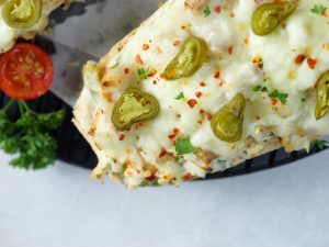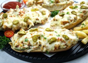 -Dinner roll/buns ki ek side per creamy veggies,tayyar chicken,cheddar cheese mozzarella cheese,lal mirch crushed & pickled jalapenos dal dein.