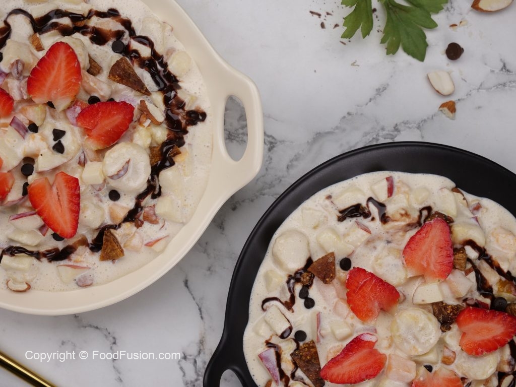 -Fruit bowl mein cream dal ker ache tarhan mix karein aur thanda ho janay tak refrigerate ker lein.-Serving plate mein creamy fruit chaat,injeer,badam,chocolate ganache,creamy fruit chaat & chocolate chips dal dein & strawberry sa garnish ker ka serve karein!
