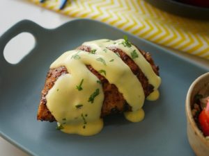 -Cutting board per chicken thigh pieces rakh dein aur dono sides per Dijon mustard ko brush ki madad sa laga lein.