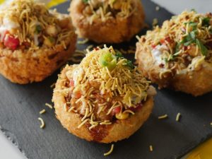In a bowl,add gram flour,rice flour,coriander seeds,red chilli powder,chaat masala,salt,turmeric powder,cumin seeds,red chilli crushed,carom seeds,baking soda,orange food color & mix well.