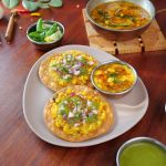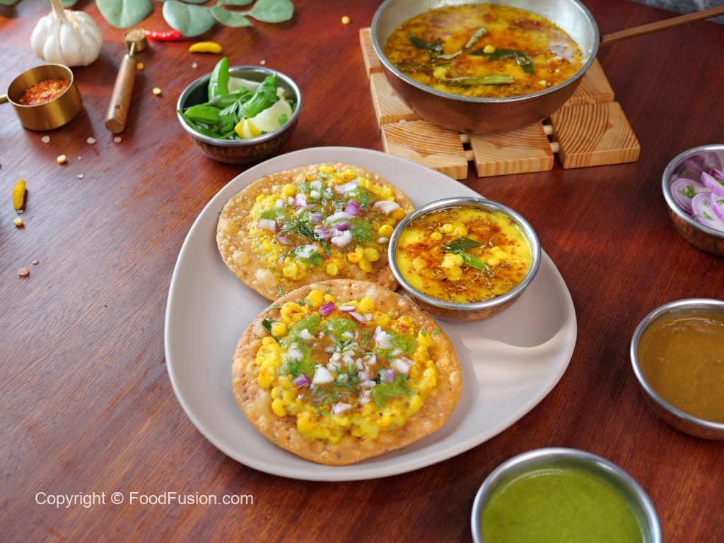 -On a fried pakwan, add prepared daal, spice mix, hari chutney, imli ki chutney, onion & garnish it with fresh coriander, & lemon wedges.