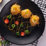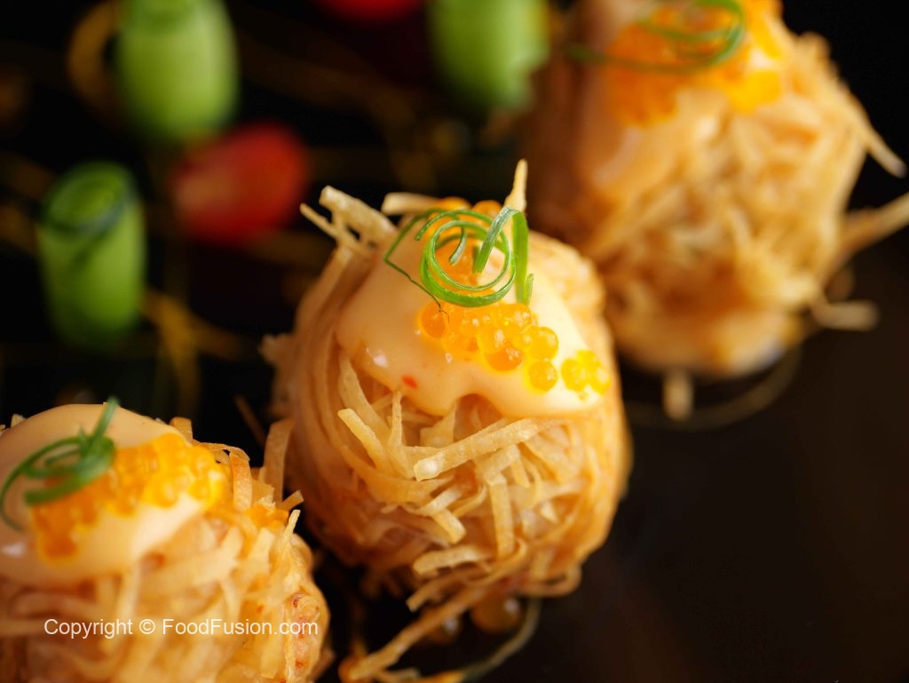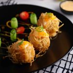 -Garnish karen bang bang sauce, caviar, green onion, cucumber aur cherry tomato ke saath.
