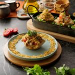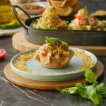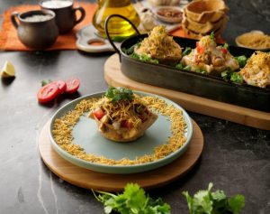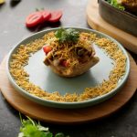 On dough pocket,add bhondi,chaat masala,potato,tomato,onion,spicy hari chutney,imli ki meethi chutney,prepared yogurt,chaat masala,red chilli powder,sev nimco & serve!
