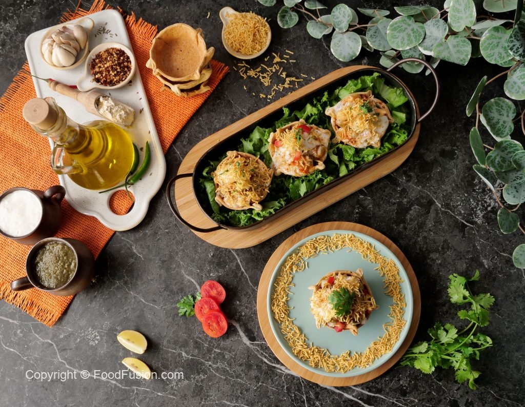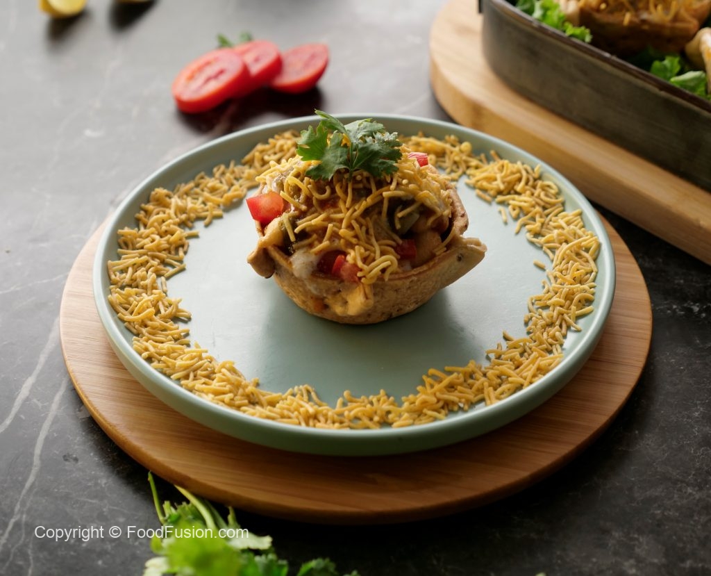 Dough pocket mein bhondi,chaat masala,aalo,tamatar,pyaz,spicy hari chutney,imli ki meethi chutney, tayyar dahi,chaat masala,lal mirch powder aur nimxo sev dal ker serve karein!
