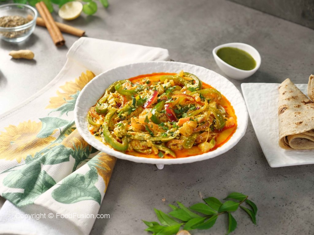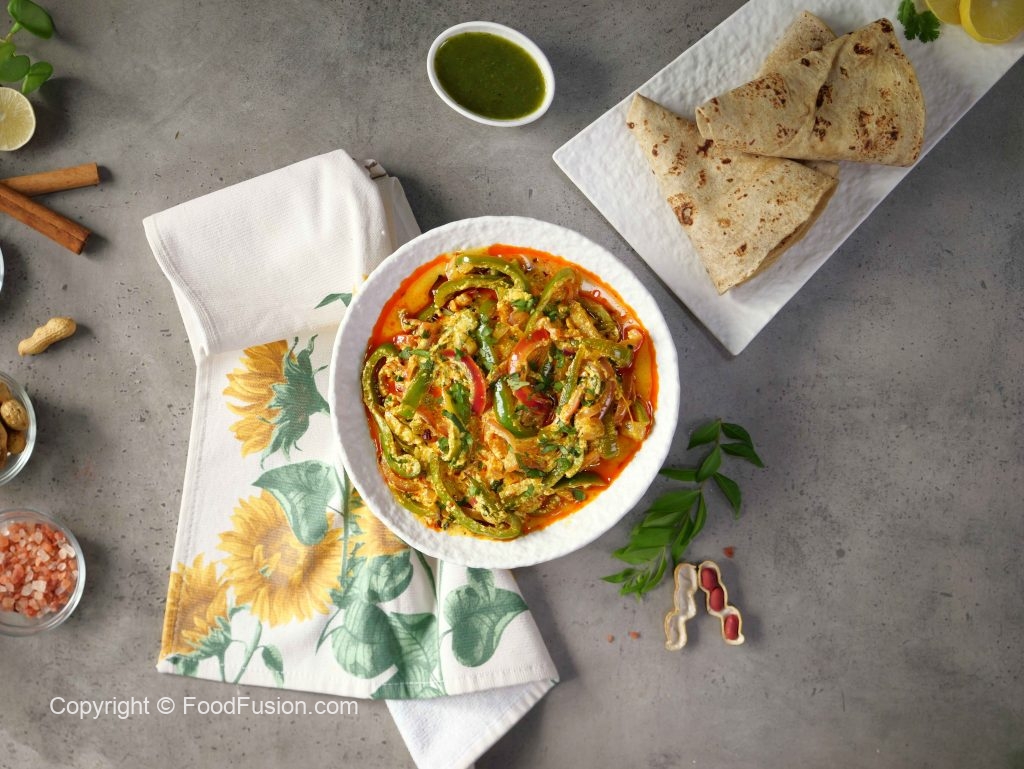-Shimla mirch ke beej nikal kar julienne cut karein aur pyaz ko half-moon slices mein cut ker lein.