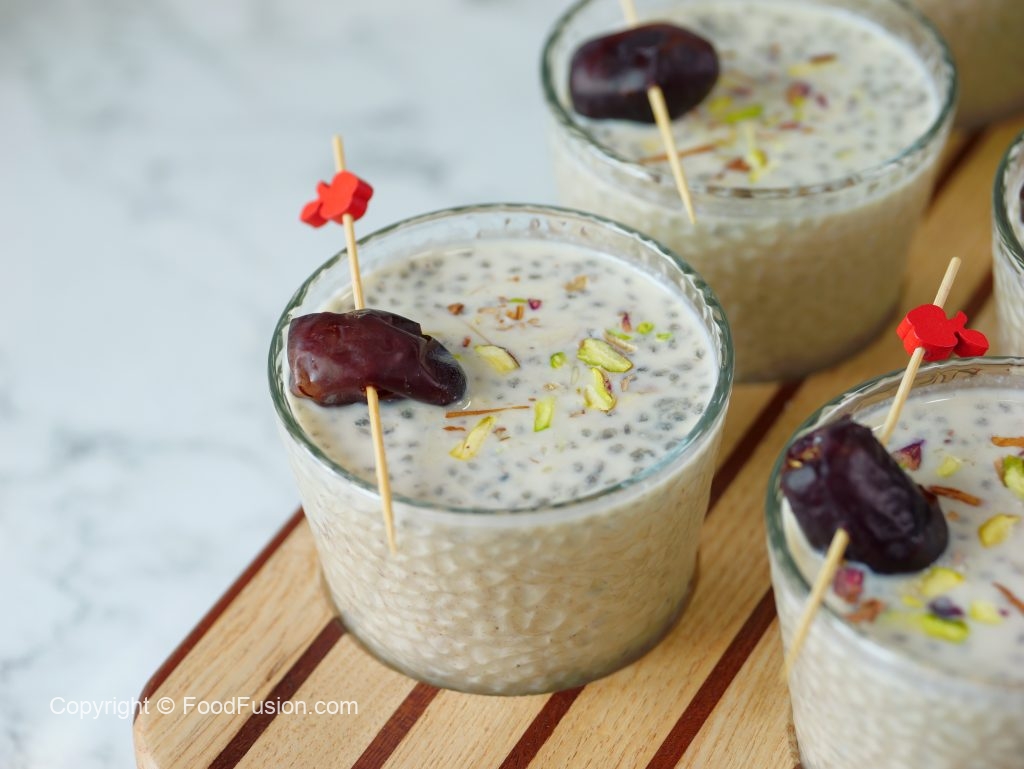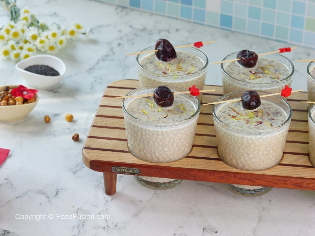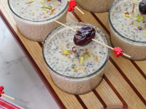 -In a serving jug add soaked basil seeds, ice cubes, dates sharbat. Then mix well.