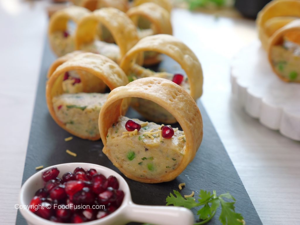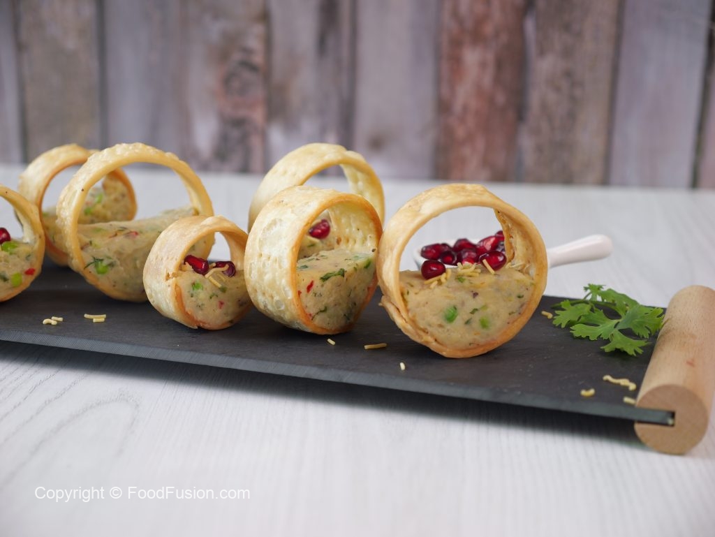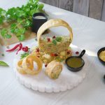 -Deconstructed samosa chaat ko anar,nimco sev,tamatar,pyaz,chanay,green chutney & imli chutney ka saath serve karein!