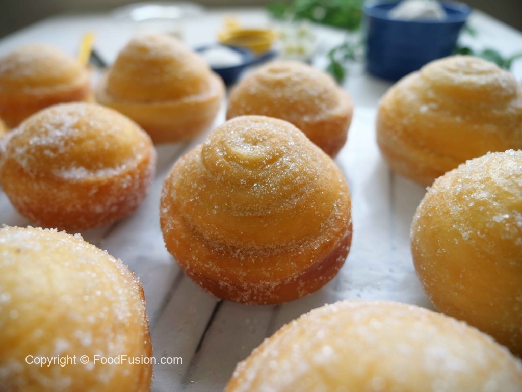 -Karahi mein cooking oil garam karein (140°C) aur halki ancch per golden ho janay tak fry ker lein aur bareek cheeni mein ache tarhan coat ker lein (makes 12).