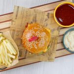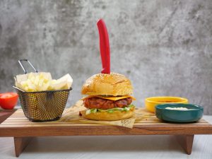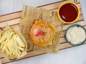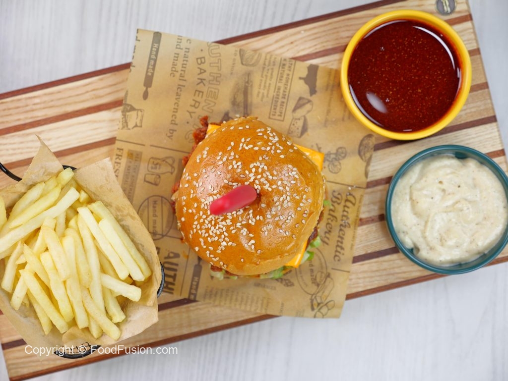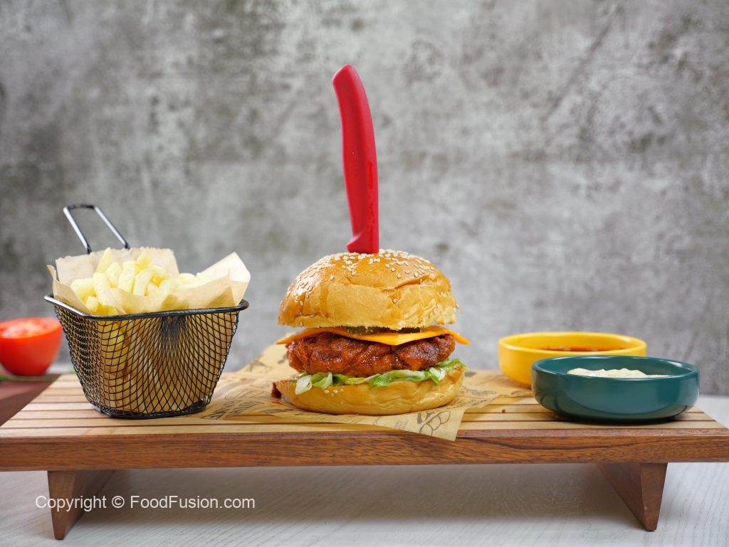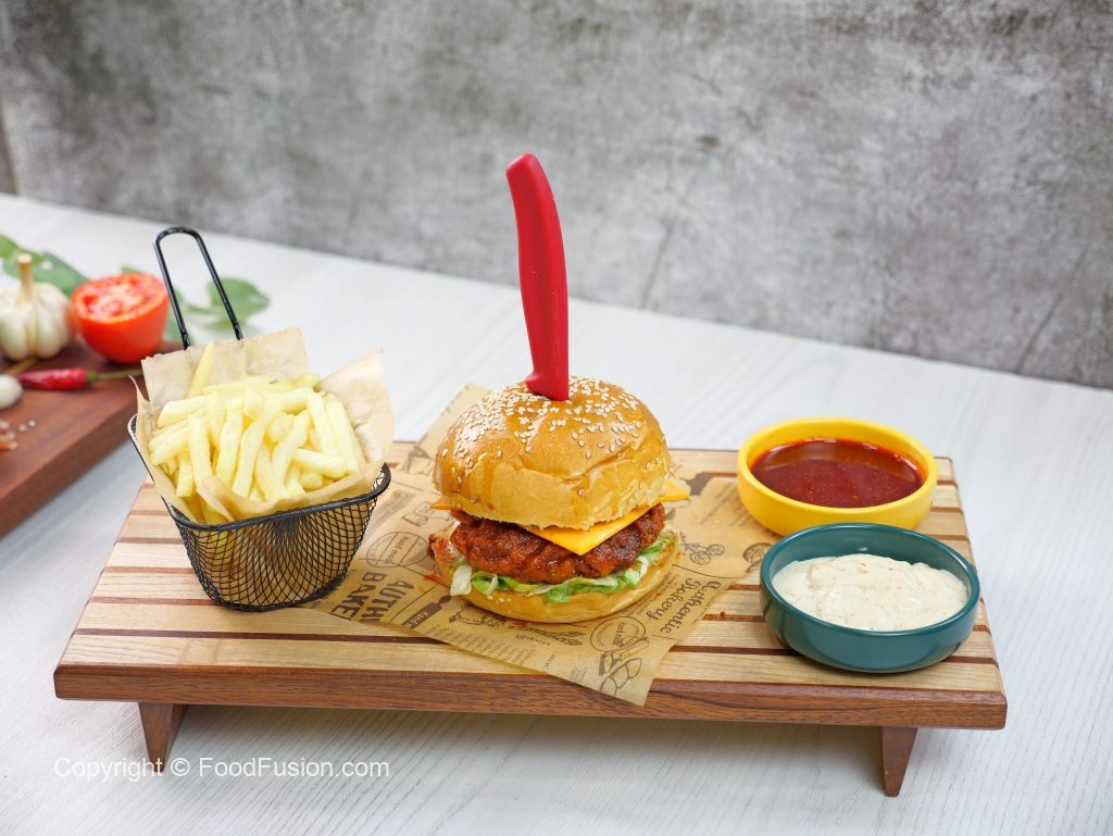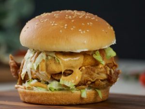 -On toasted bun,add & spread prepared mayo garlic sauce,iceberg lettuce,crispy fried chicken,apply magic spice oil,cheddar cheese slice,pickled cucumber,mayo garlic sauce & top with another bun (makes 5).