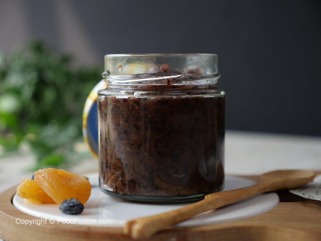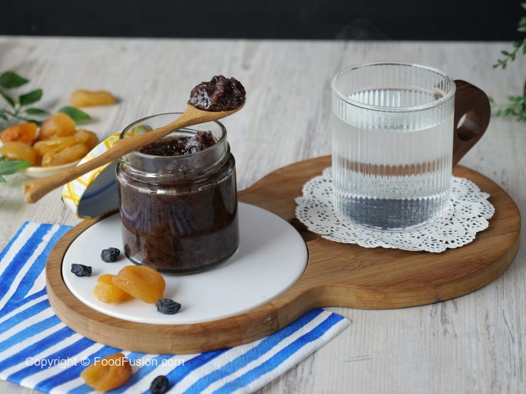-In a bowl,add dried apricots,black raisins,hot water,cover & soak for 25-30 minutes then strain & blend well with the help of blender.