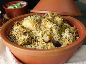 -In a cooking pot,spread thin layer of rice,marinated chicken,remaining boiled rice,garam masala powder,mint leaves, fresh coriander,fried onion & clarified butter.