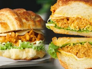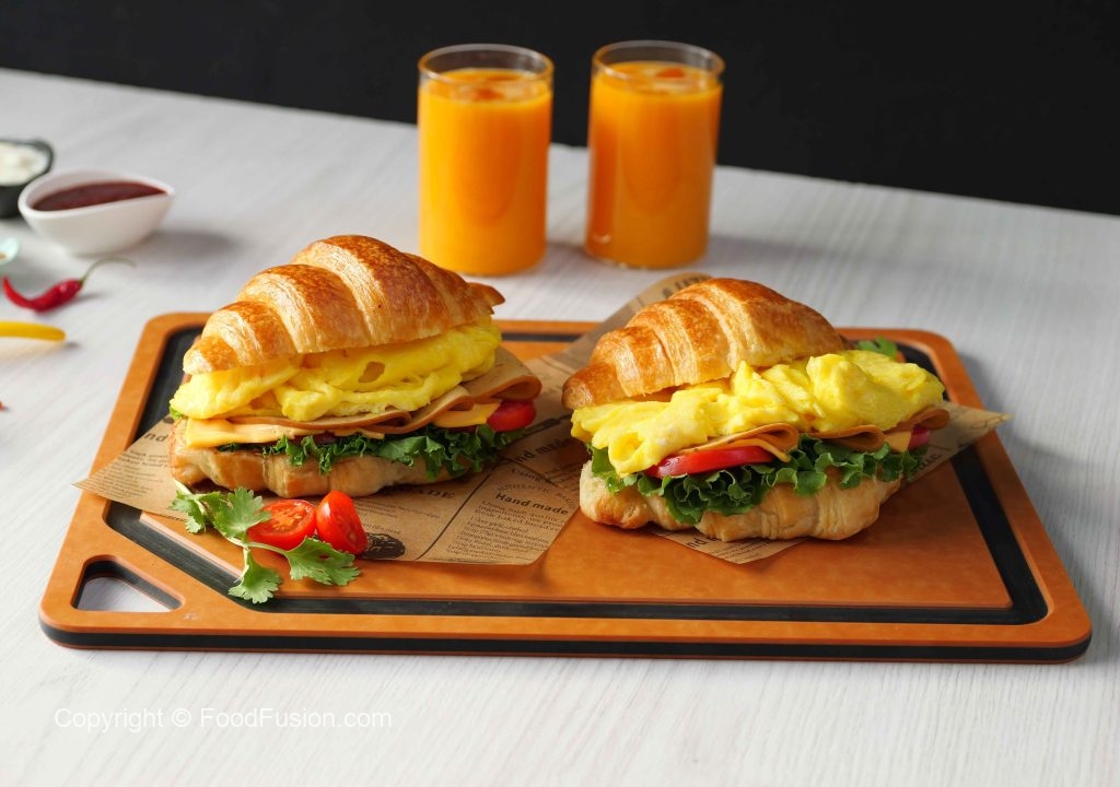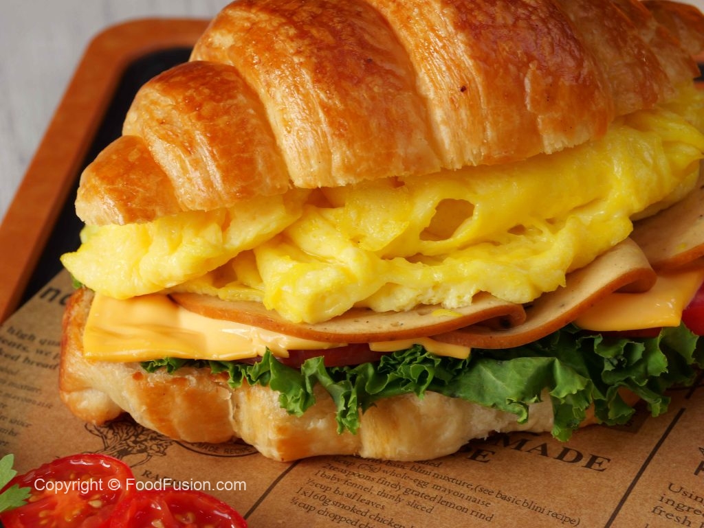 -Toasted croissant par tayyar sauce,salad patta,tamatar slices,cheddar cheese slices,mortadella slices aur scrambled egg rakh kar doosra croissant upar se rakh dein (makes 2).