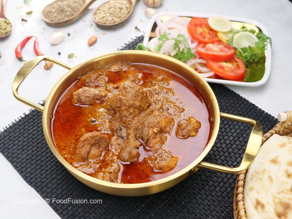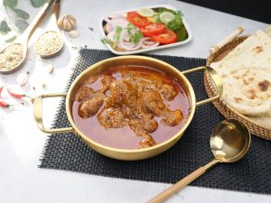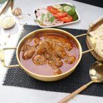 -Pot mein dahi,adrak lehsan paste,kashmiri lal mirch powder,dhania powder,namak,lal mirch powder,hari elaichi,sabut kali mirch,laung,fried pyaz,blended paste,ghee aur pani dal ker ache tarhan mix ker lein.