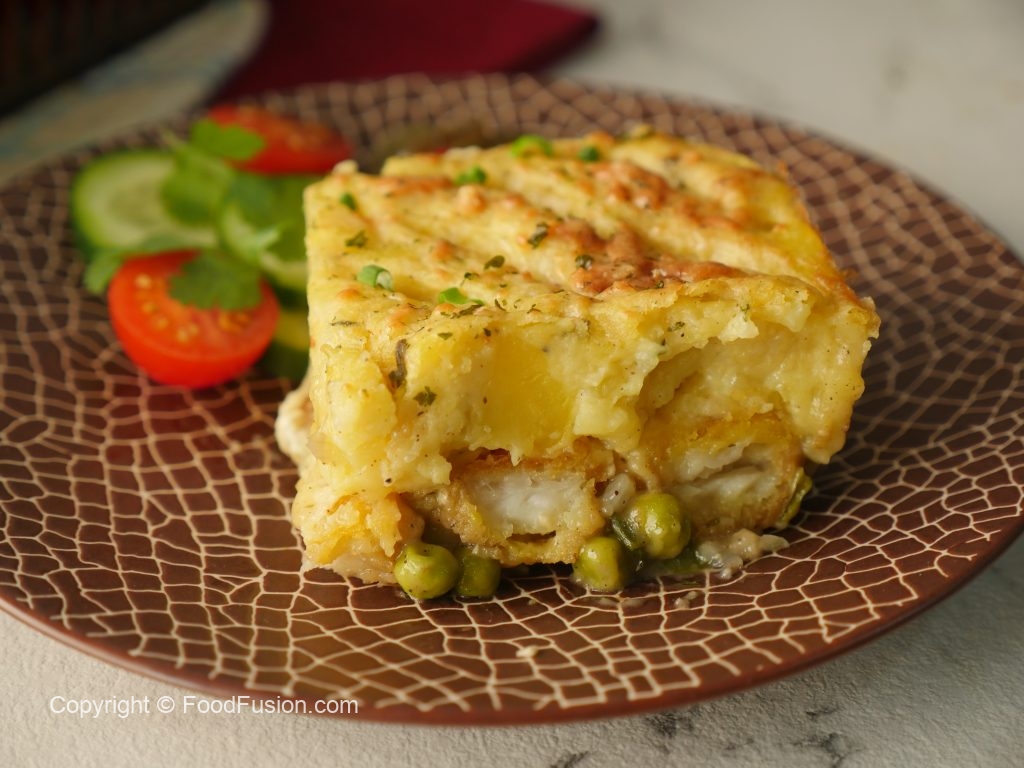 10 x 4 inch ki baking dish may pehle tayar sauce, phir fried fish, mozzarella cheese, cheddar cheese or tayar creamy potato daalen. Spoon ki madad se level karen or design banayen.