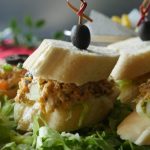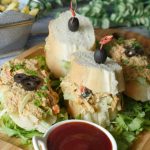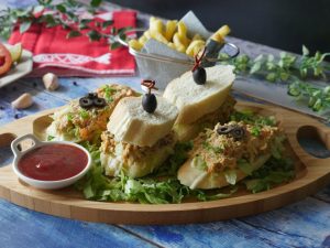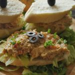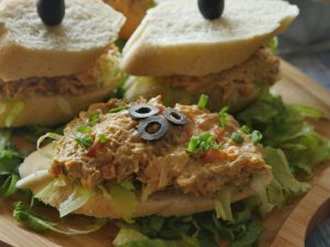 On french bread slice,add iceberg lettuce,prepared fish filling and place another french bread slice on top and & garnish with black olive.