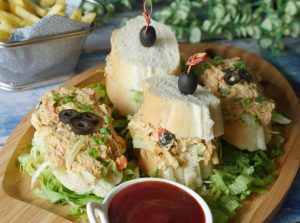 French bread per iceberg,tayyar fish filling,black olive aur hara pyaz leaves dal ker serve karein (makes 8-10).