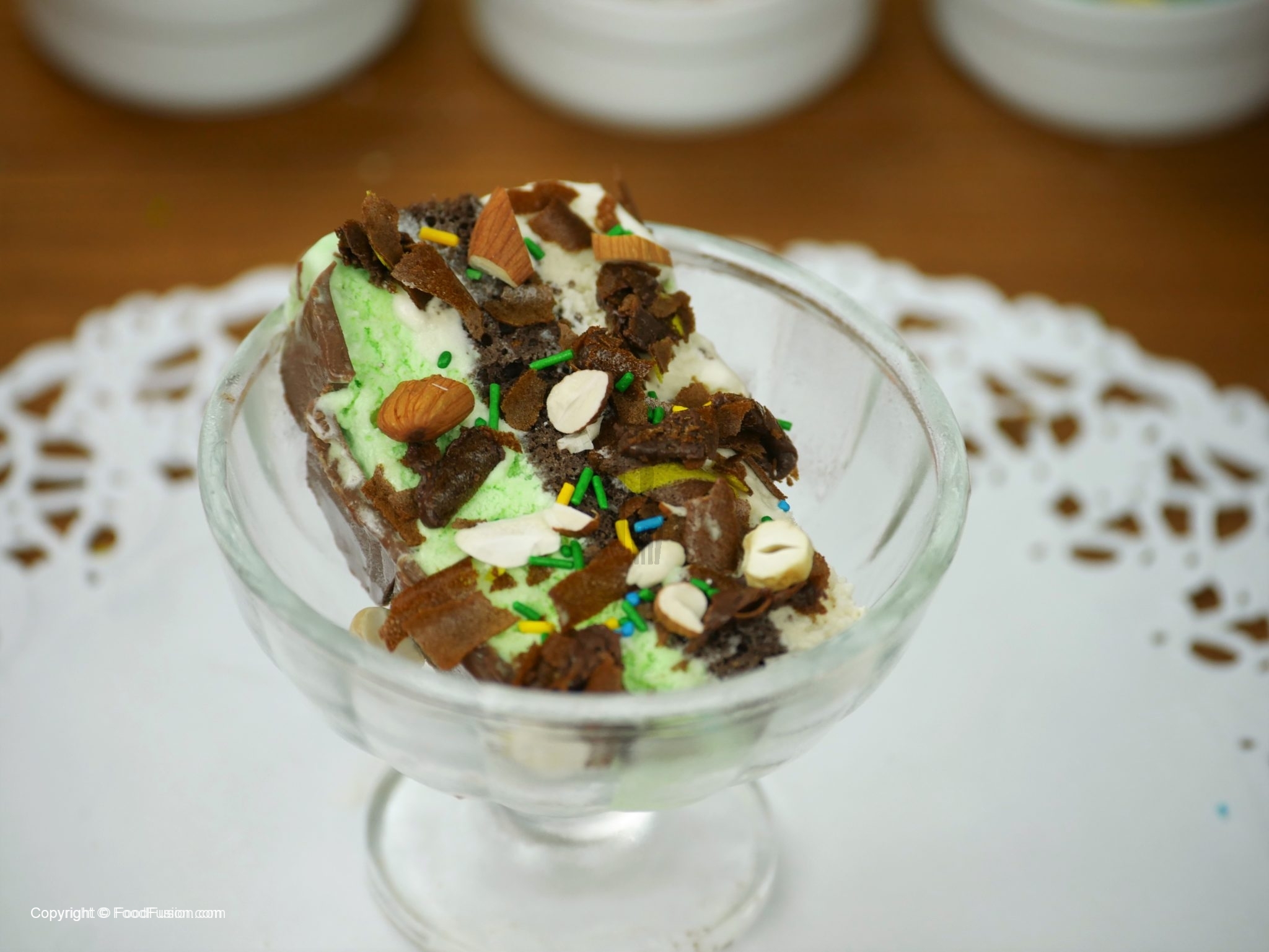 For glass decoration,take ice cream bowl, dip into melted chocolate and coat with rainbow sprinkles.