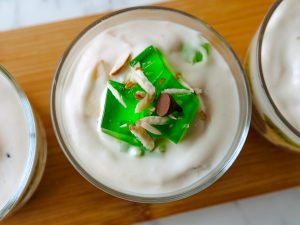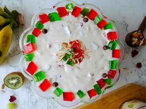 Add red & green jelly & give it a good mix (add jelly just before serving).