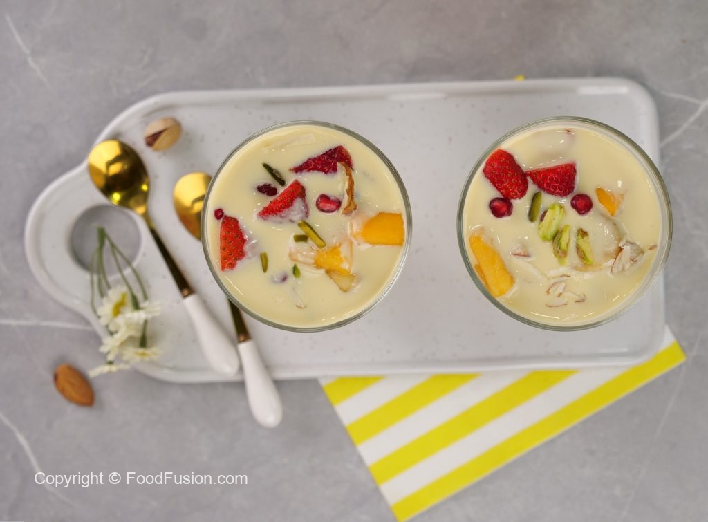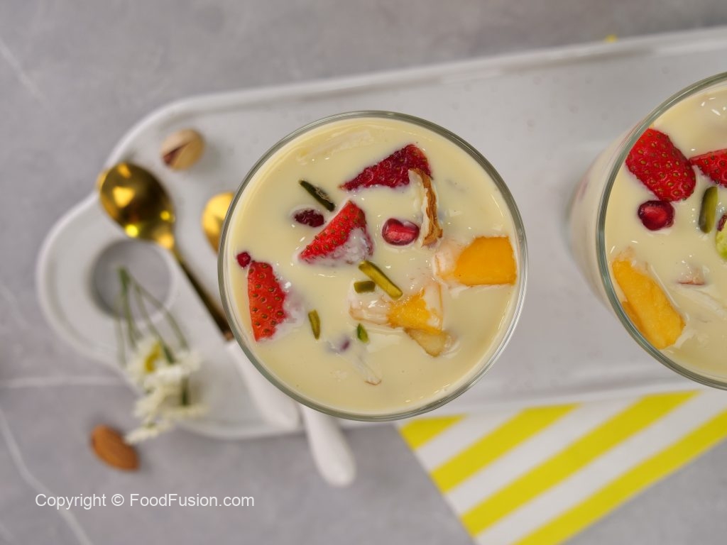 Enjoy a guilt-free treat this Ramadan! Try this Sugar-Free Fruit Custard, sweetened naturally with Tropicana Slim Stevia – a plant-based sweetener for a low carb delicious dessert! #LowCarbDessert #SugarFree #RamadanSpecial #TropicanaSlimStevia #FruitCustard #FoodFusion #happycookingtoyou