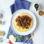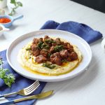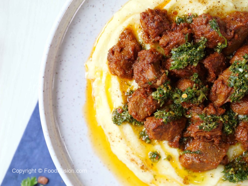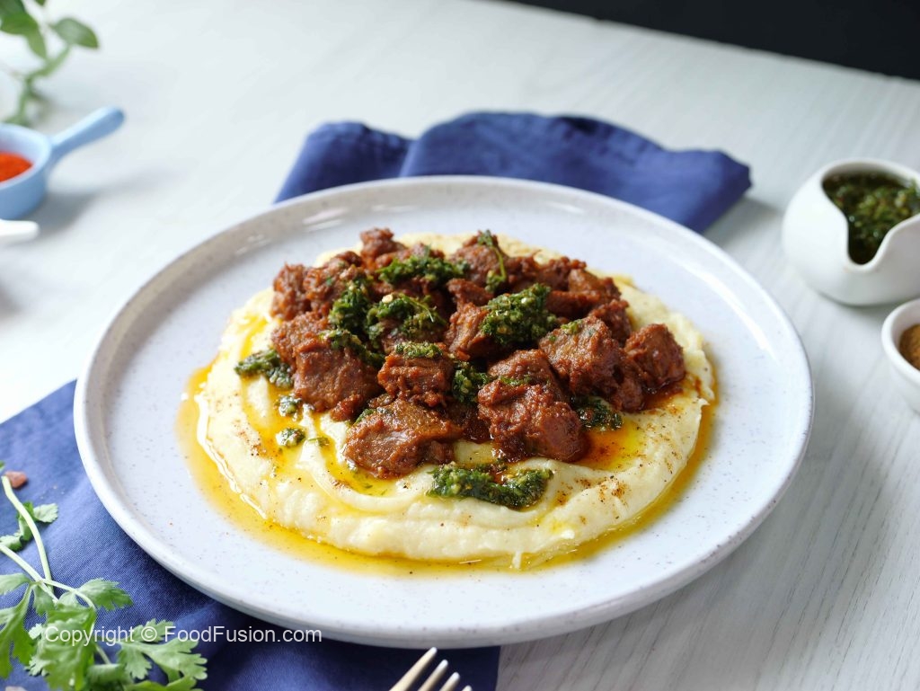-Serving dish mein mashed potato,chimichurri sauce,fry beef boti,chimichurri sauce aur chaat masala dal ker serve karein.